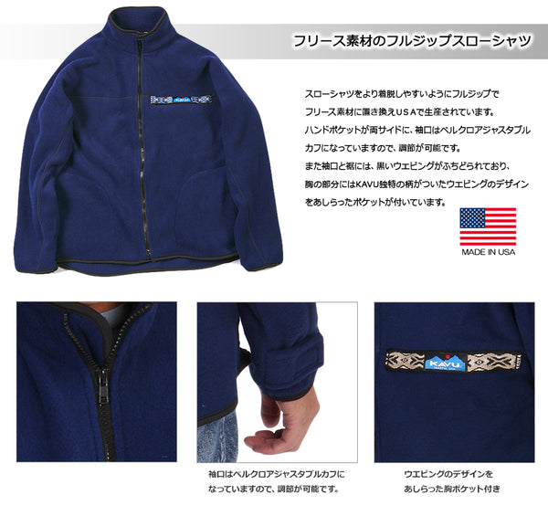 KAVU カブー フリース フルジップ スローシャツは、定番のKAVUスローシャツをフリース生地で表現したフルジップタイプのアイテムです。キャンバスコットンタイプのスローシャツ同様、ラグランスリーブ仕様なので、腕の稼働領域が広く上半身のスムーズな動きを妨げることはありません。胸の部分にはKAVU独自のパータンで織られたウェイビングとジッパーポケットが付いています。またハンドポケットが両サイドに付き、袖口はベルクロアジャスタブルカフになっているので調節が可能です。冬でもアクティブに過ごす為の必須ウェアとなり、コーディネイトの幅も広がります!コットン素材のモデルと同じこだわりのアメリカ製です。