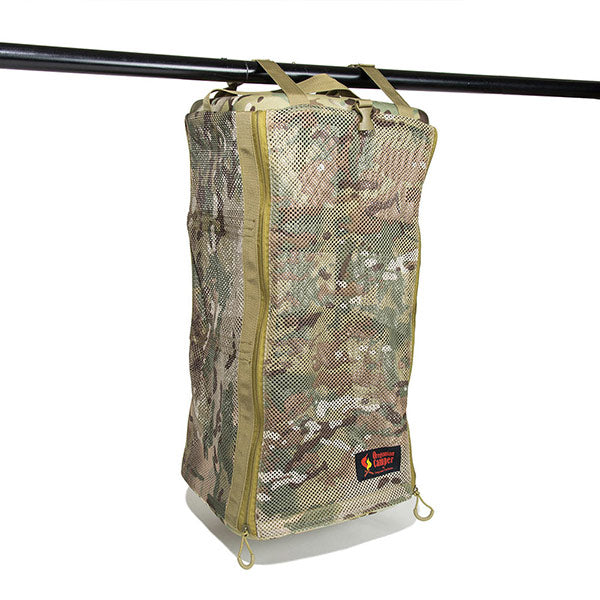 新提案。吊して収納する縦型収納棚、キャンプシェルフです。仕切りは収納内容に応じて1~3室へ可変、本体を畳めば厚さは僅か8cm。フロントシェードを閉じると、蚊帳(かや)代わりとしても使えます。洗った食器や余った食材などを保管するのに便利。キッチン回りやテント内で活躍する、便利アイテムです。