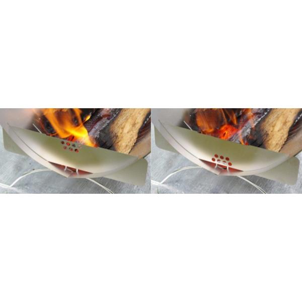 火加減の調整がしやすい五徳付きで、市販の薪もそのまま気兼ねなく投入できる広い火床。TABI譲りの形状は燃焼効果が非常に良く、熾火を作りやすい設計です。