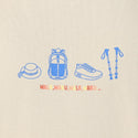 フロントプリントはハイキングの持ち物を並べ、たくさん歩くを意とする『WARK WARK』と、準備中の楽しみで仕方がない『WAKU WAKU』を掛け合わせており、バックプリントには英文で「人生の良い波に乗ろう」と描き、ザ・ウェーブと人生を掛け合わせました。