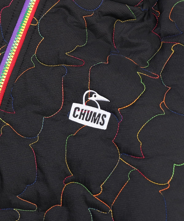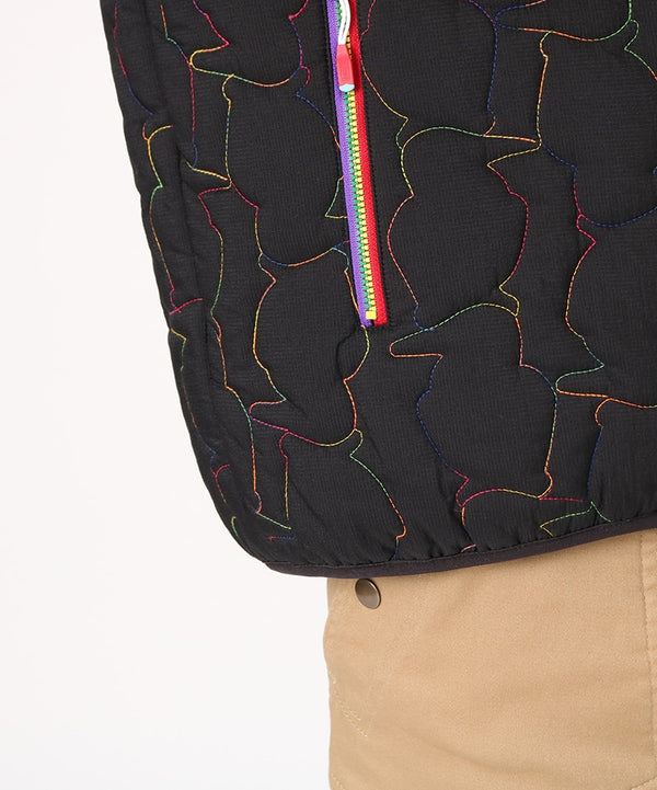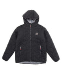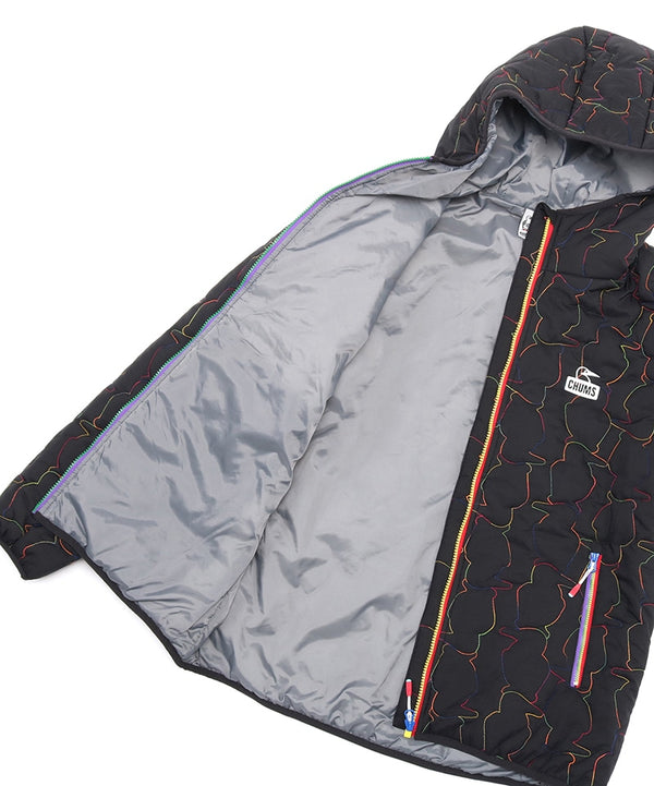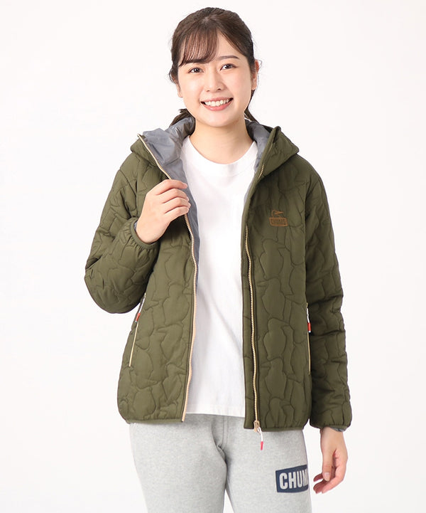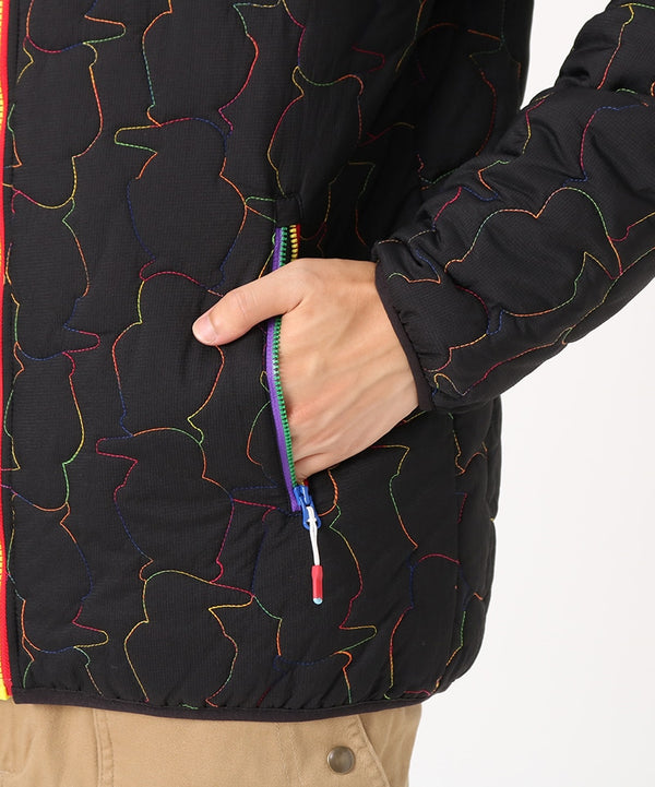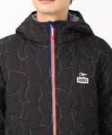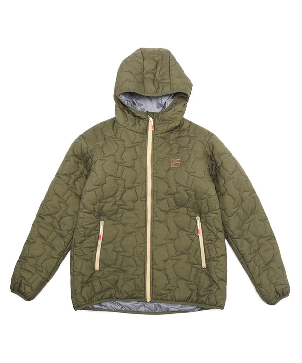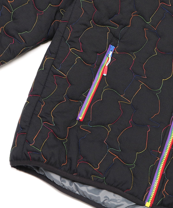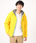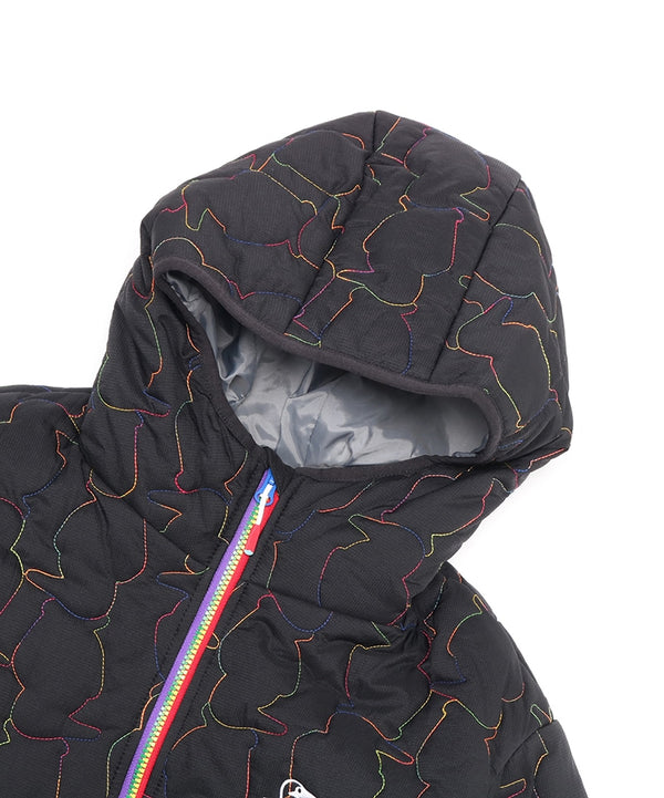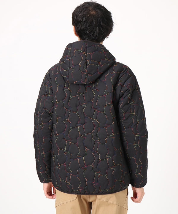 軽くてあたたかい中綿入りフード付きジャケット。厚すぎない程よいボリューム感で、インナーにスウェットやニットなど肉厚なアイテムも着用可能。ブービーバードのキュートなシルエットをキルティングの柄として落とし込んだあそびゴコロ溢れる表情が特徴。