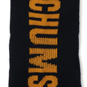 足首部分にはぐるりとCHUMSの合言葉「HANG WITH YOUR CHUMS」(チャムスと一緒に楽しもう)を、足甲部分には大きく「CHUMS」の文字を編み込んでアクセントに