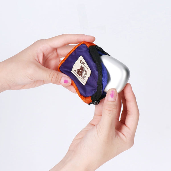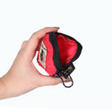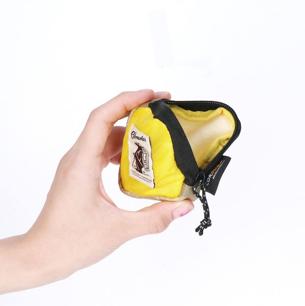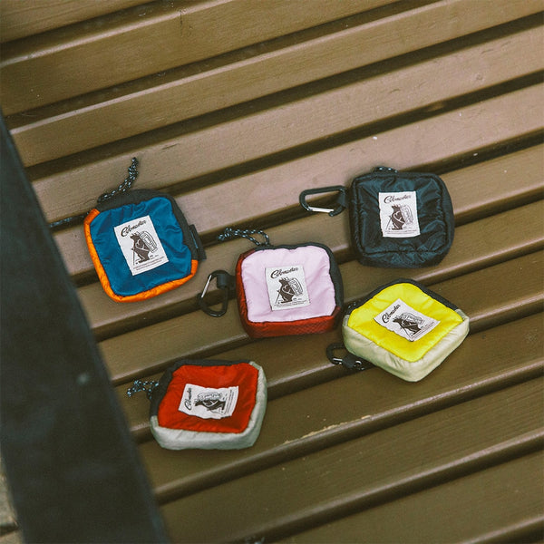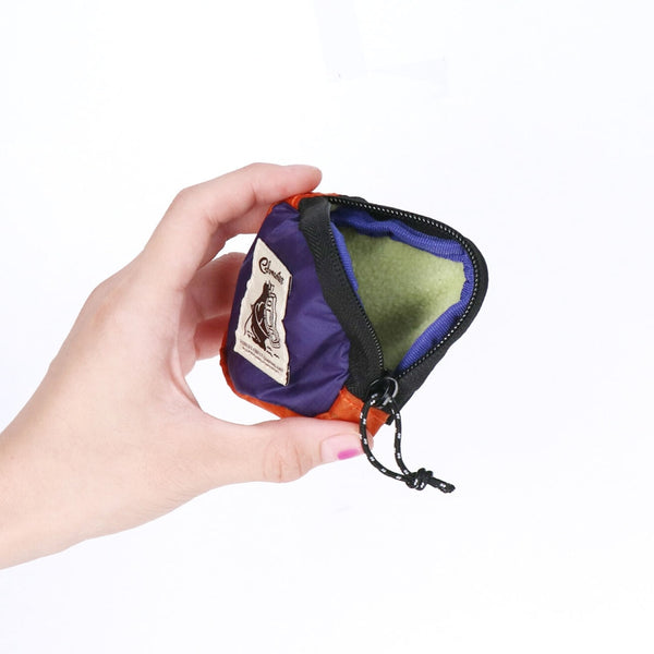 表地は強度と防水性に優れたコーデュラシルナイロン素材、裏地にはフリース生地を使用したカラビナ付きミニポーチ。