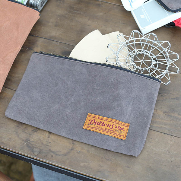 ワックスコーティングを施したキャンバス生地が、どこかビンテージ感を醸し出すポーチ。 アウトドアやキャンプシーンでかさばりがちな小物をまとめたり、 デイリーシーンでも使いやすいサイズなので、Sサイズではカトラリーやペグを収納したり、Lサイズは使いやすいA4サイズなので、書類やタブレットを収納したり。使えば使うほどに味わいが増していくので、自分好みに育て上げて愉しむことができます。 クラッチバッグとして使うも良し、バッグのインナーポーチとして使うも良し。 多目的にお使いいただけます。