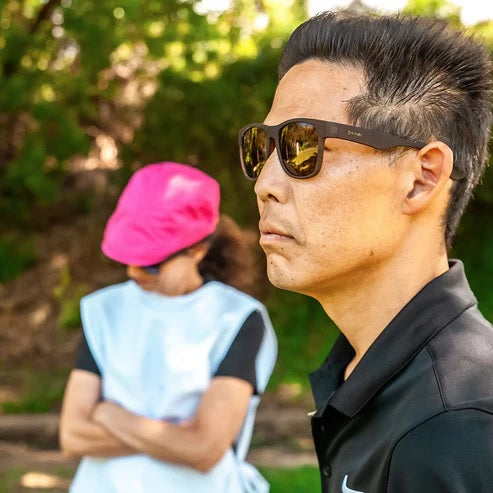 - 馴染みの良い木目調デザイン。ハイコントラストレンズ採用で、ゴルフにも◎