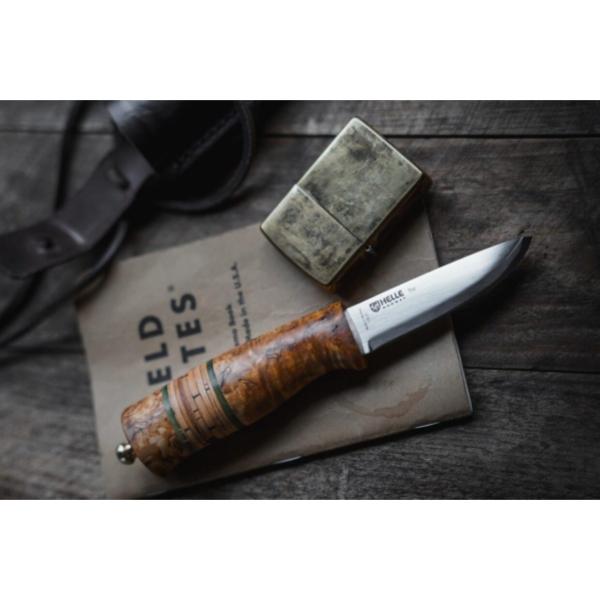 ヘレナイフではお馴染みのカーリーバーチ材と、「葉」をイメージしてグリーンに染められたレザー、その間にバーチバーク・ヴェニア (白樺の皮の薄片) を幾重にも挟み込んだ印象的なデザイン。ひとつとして同じものはない、自然の木々の美しさを表現した特別なハンドルです。