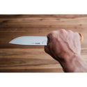 緩やかにカーブが付けられたグリップデザイン。ブレードに近い付け根の部分で握ると、より繊細な作業に最適です。チョッピングなど、振り子の原理を利用した振り下ろすような動作が得意なポンメルグリップ (グリップのエンド部分に合わせて握り込む) を使えば、パワーが必要な作業にも対応。逆手にも握りやすく、多様なグリップを可能にします。