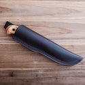 ハンドル部に使用されている滑らかなカーリーバーチ材は、北欧らしさ満載。使うにつれ手に馴染み、愛着も増していきます。シースには高品質なブラウンのレザーを使用しています。