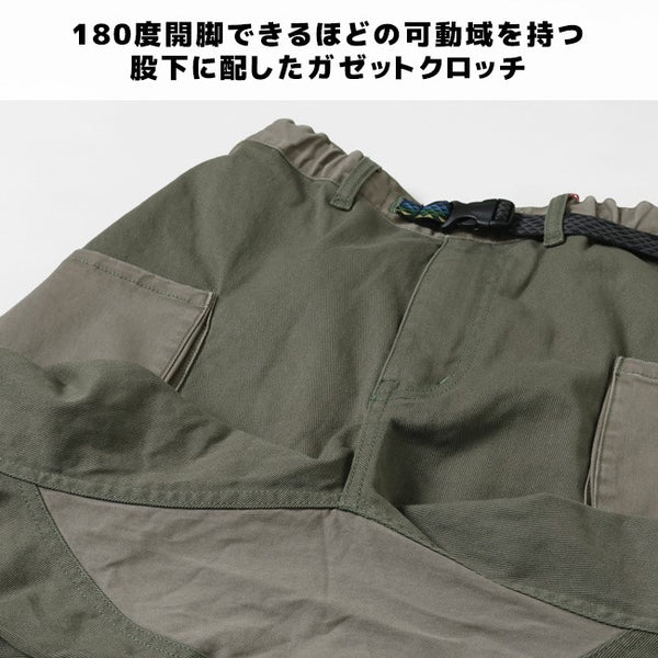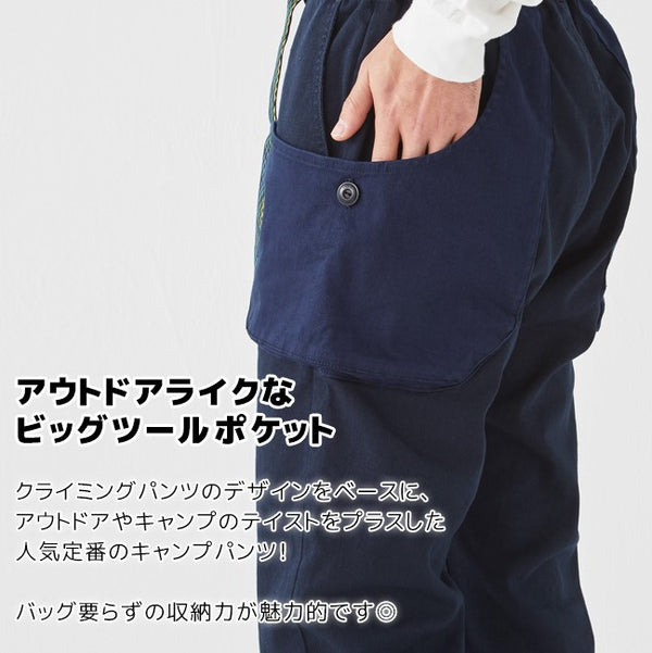 クライミングパンツのデザインをベースに、アウトドアやキャンプのテイストをプラスしたキャンプパンツ。