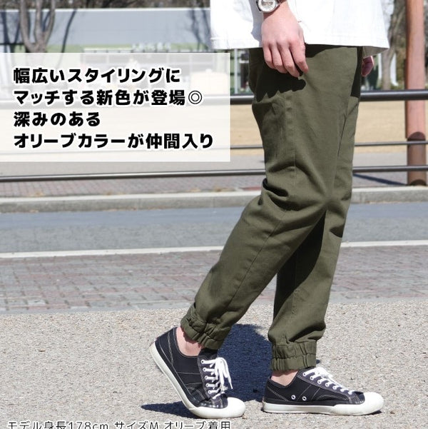腰周りはややゆったりめですが、テーパード&裾口内蔵ゴム仕様で足元をスッキリとさせたシルエットです。