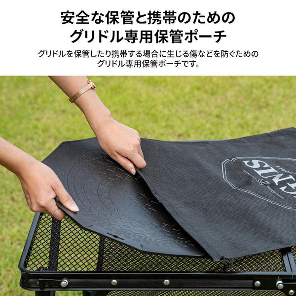 焼き物、炒め物、汁物など様々な料理が作れるよう、常に余裕のあるサイズと深さのあるイグニスデザイングリドルは、ノンスティックブラックマーブルコートなので調理中にこびりつきにくく、調理後でもお手入れに便利です。グリッドのブラックマーブルコーティングはFDAの安全認証を完了し、人体に有害なPFOA成分が検出されないことが認められています。さまざまなタイプのバーナーに対応するグリッドは、いつでも便利に使えるという利点があります。キャンプホースバーナーや強塩バーナー、プレートバーナーなど様々なバーナーに対応するイグニスデザイングリッドは、IHや家庭用ガスバーナーにも使えるので、屋外だけでなく屋内でも使用することができます。イグニスデザイングリッドを移動させたり、メッキ加工する際に欠かせないウッドハンドルは、高品質な無垢材を使用し、グリッドのスムーズな使用をサポートします。