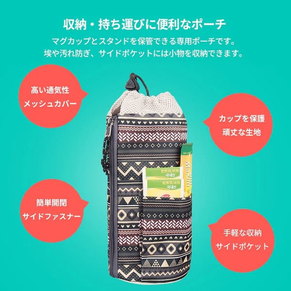 ステンレススチール製で二重真空構造で保温、保冷効果に優れたマグカップセットです。手軽に保管できるマグカップスタンド付き。