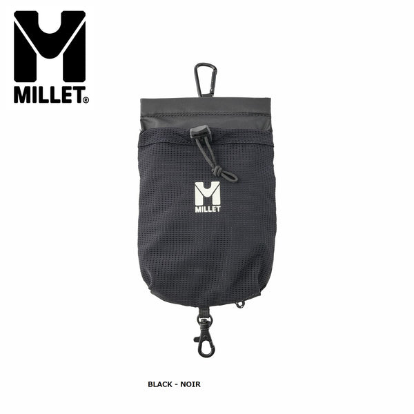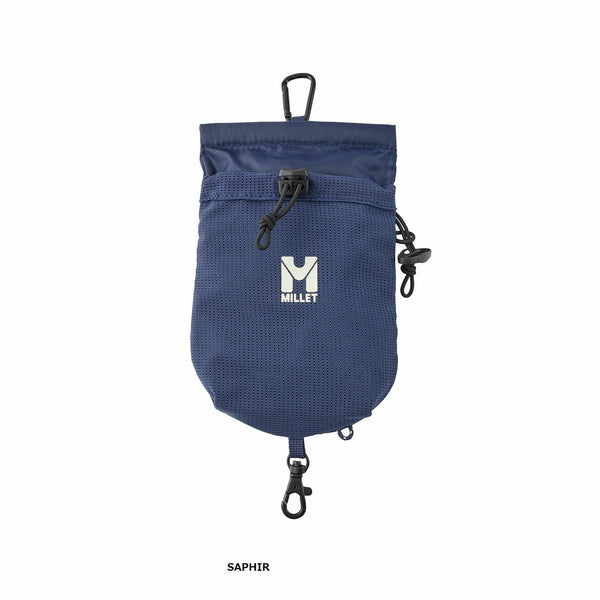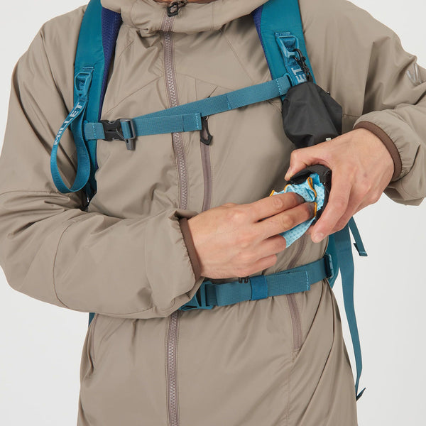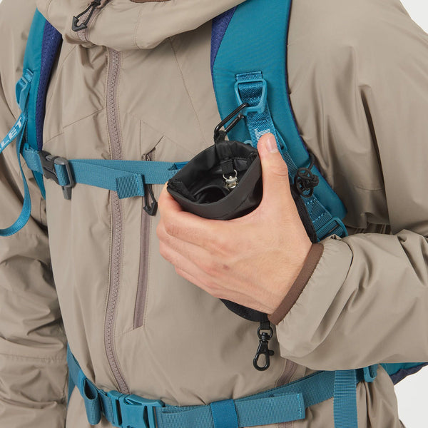 リュックのショルダーハーネスに上向きで取り付けると出し入れ簡単なスマートフォン収納や500mlのペットボトルホルダーにもなるポケット。