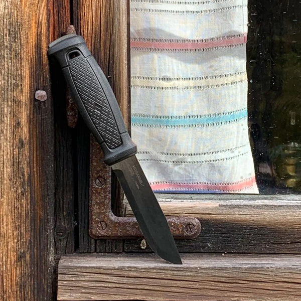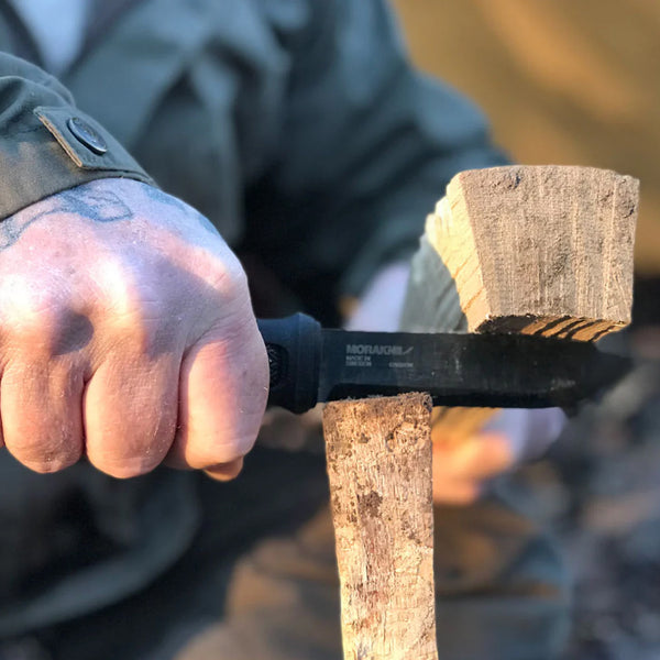 モーラナイフのアウトドアナイフ全ラインナップのなかで、最も強靱で重量感のあるハイエンドモデル。ブレードは刃厚3.2mmのフルタング(鋼材がグリップエンドまで通っている)と構造になっており、非常に耐久性が高いモデルとなっています。鋭い切れ味を備えた高品質のカーボンスチールは、ドイツの「WAELZHOLZ」社の炭素鋼を使用し、モーラナイフ独自の加工を施しています。1%の炭素を含むブレードは、長期間にわたって最大の切れ味を発揮するよう研ぎ直しがしやすくなっており、靭性のある吸い付くような切り心地が特徴です。ブレードの表面にはカーボンスチールのデメリットである錆びやすさを軽減するためのDLC(Diamond Like Carbon)コーティングを施しています。このコーティングはブレード表面の光の反射を低減する効果や、耐摩耗性の向上などももたらしています。※DLCコーティングはブレードを研いだりすると自然に取れるものです。スチールが剥き出しになった部分は、極力水分を取り除きよく乾燥させ、植物性のオイルを塗るなどのメンテナンスを施すことをおすすめします。