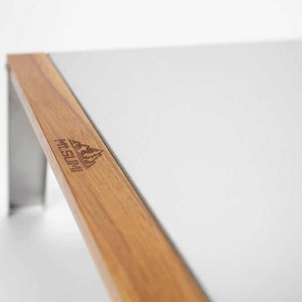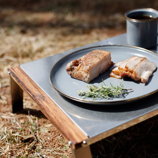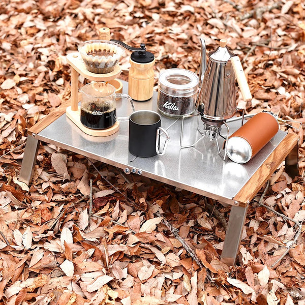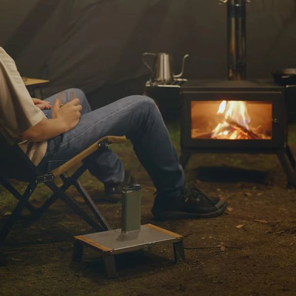 無垢の木と、焚き火のそばでも安心して使えるステンレス素材を使用。小さくても本物の質感にこだわりました。