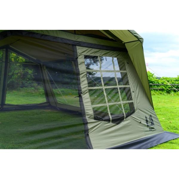 屋根部分のフレームにアルミを使用し、ポリエステルリップストップ75d生地のフライにすることにより従来よりも軽いロッジシェルターの登場です。