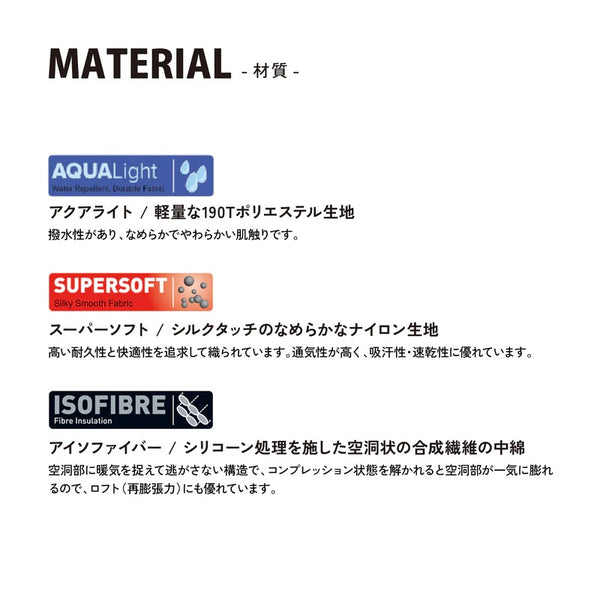 ●外側の生地には190Tの軽量なポリエステル生地「AQUA Light」を使用。撥水性があり、なめらかで肌触りが良いことが特徴です。