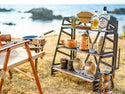 コンパクトに折りたたむことができ収納スペースもたっぷりあるNATURE TONES(ネイチャートーンズ)のTHE THREE STAGE RACK(スリーステージラック)。ロールスタイルに適した3段のラックは省スペースながら十分な収納スペースを確保。また最上段の棚にあるデザイン部にはドリッパーを置くためのスペースを設けており、最適な抽出量を測れるように上段と中段はスケールとカップをおける十分な高さを確保しています(18cm)。本体背面の脚部には安全に使用して頂けるよう固定用のペグ穴がついています。