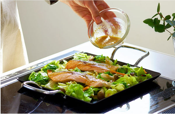 十分に蓄えた熱をじっくり食材に伝えることで、外はカリッ、中はふっくら食感に。旨みが凝縮された究極のごちそうが、鉄板で焼くだけで完成します。