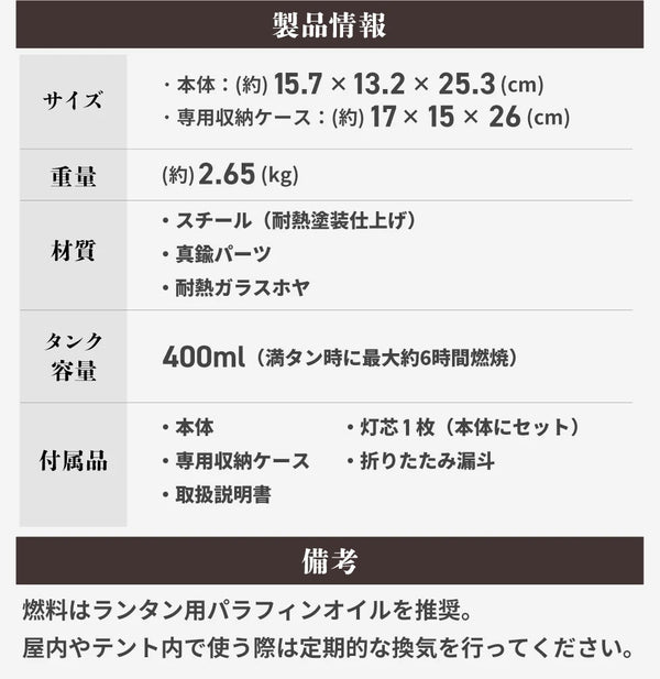 | 付属品 | ・本体 ・専用収納ケース ・灯芯1枚(本体にセット) ・折りたたみ漏斗 ・取扱説明書 |