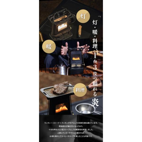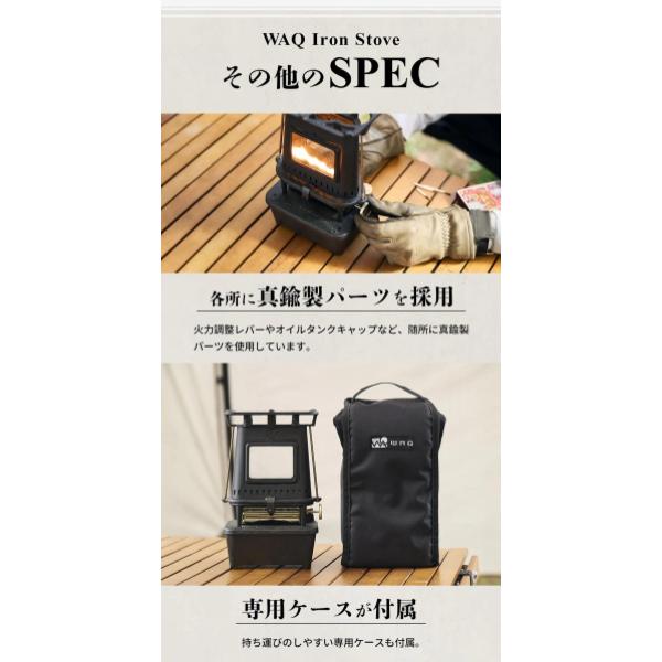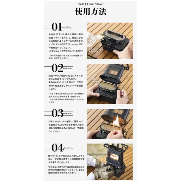 | 注意事項 | ・一酸化炭素や未燃焼ガスが溜まるのを防ぐため、換気の良い場所で使用してください。また屋外でも水平で安全な場所でご使用ください。 ・給油の際は近くに火気、可燃性物質、電気ヒーターなどの着火源がないことを確認し、他の人から離れて行ってください。 ・燃料によっては、少量の黒煙や臭いが発生する場合がございます。煤の発生しにくいパラフィンオイルを推奨しています。 ・使用時および保管時には子どもの手の届かない場所に置いてください。 ・点火後、アイロンストーブの五徳やホヤは非常に高温になりますので、移動させる際はオイルタンク部分、または背面の持ち手を持って移動させてください。 |
