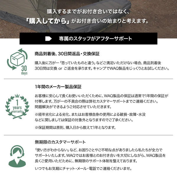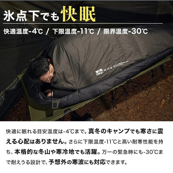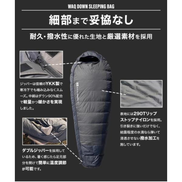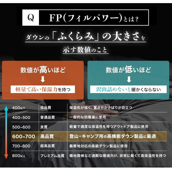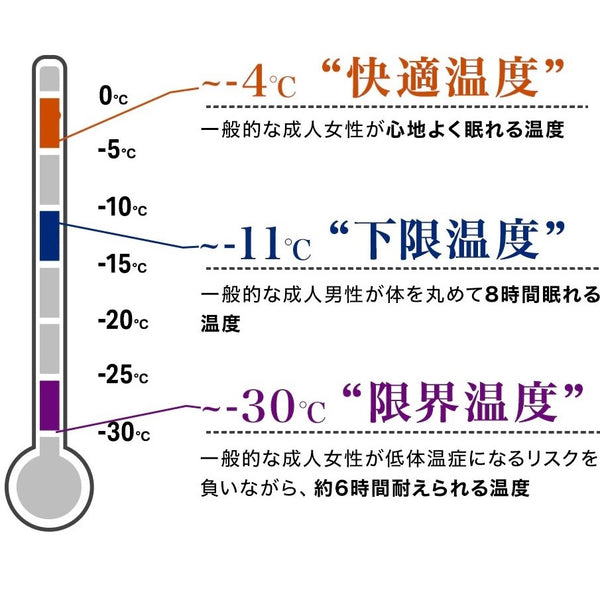 | 注意事項 | ・衣服の硬いパーツ、釘・石・貝殻・ガラス片など鋭利な物との接触は避けてください。破損の原因となります。 ・設置時は鋭利な石や枝、トゲのない平坦な場所をご確認ください。 ・火のそばでは使用しないでください。火の粉で生地が焼ける、穴があく恐れがあります。焚き火は十分に距離を取ってご使用ください。 ・密閉空間(車内など)では酸欠防止のため必ず換気をしてください。 ・極寒環境では他の保温装備と併用してください。単体では体温保持が不十分な場合があります。 ・お子様が使用する場合は、必ず保護者の監督下でご使用ください。 ・喫煙中の使用は避けてください。落下した灰で生地が焦げたり破れる恐れがあります。 ・ペットと一緒に使用する際は、爪や歯で生地を傷つけないようご注意ください。 ・ファスナーは勢いよく開閉せず、無理な操作は避けてください。破損の原因となります。 ・使用後は必ず乾燥させてください。濡れたまま収納するとカビや臭い、ダウン劣化の原因となります。テント内の結露や湿気にもご注意ください。 ・長期保管は通気性の良い付属メッシュ袋をご使用ください。圧縮袋ではなく、ゆったりと収納することで羽毛の潰れを防ぎロフト(膨らみ)を維持できます。 ・新品時や長期未使用後は中綿の膨らみが戻りにくい場合があります。開封後は軽くたたいて空気を含ませ、ダウンを回復させてからご使用ください。 |