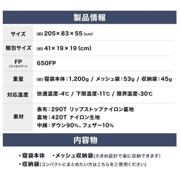 | セット内容 | 寝袋本体 / 圧縮式収納袋 / 収納袋(メッシュタイプ) / 取扱説明書 |