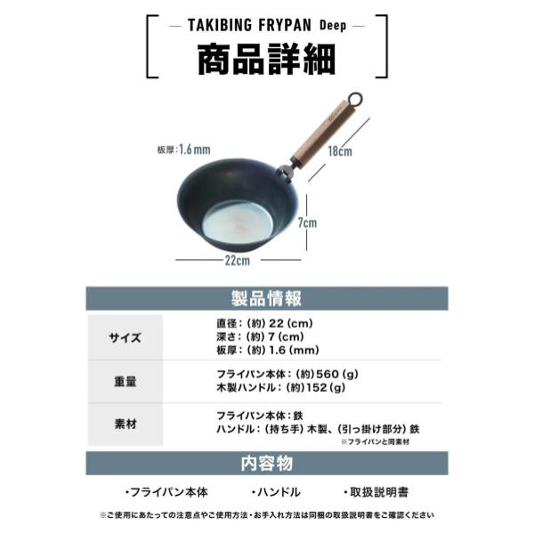| サイズ | フライパン直径:約22(cm) 深さ:約7(cm) 板厚:約1.6(mm) 木製ハンドル:約18(cm) |