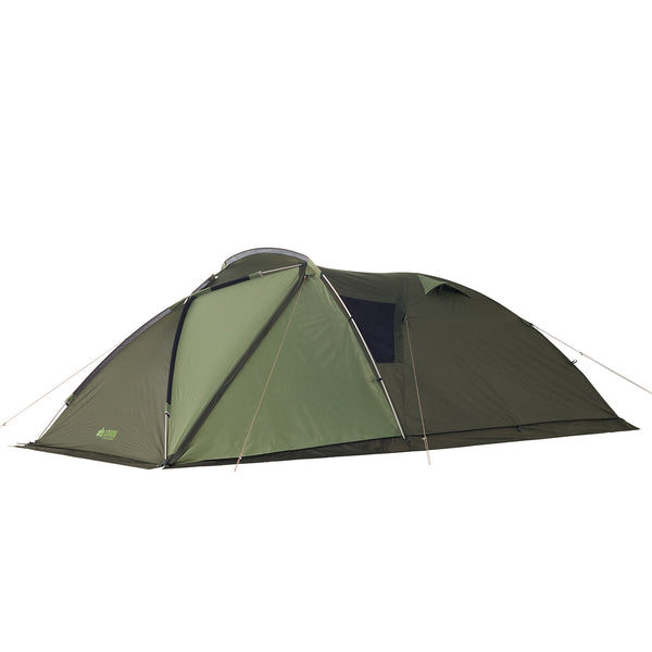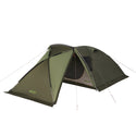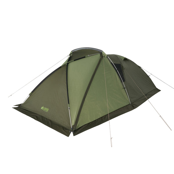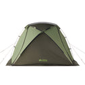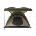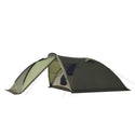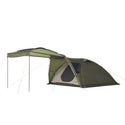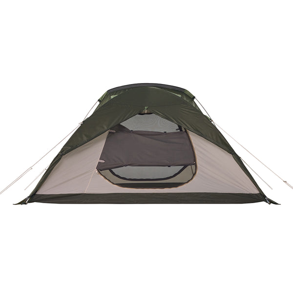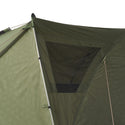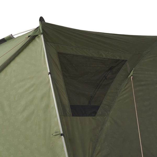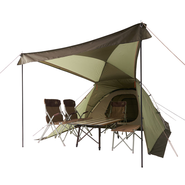 テント前面にフレームをクロス状に組み込むことで、テント全体の強度がUP。2本のポールで支えるだけでテントと一体化したタープとなるため居住空間が広がり、湾曲しているので雨だまりも防止します。またランタンを吊り下げることもできます。