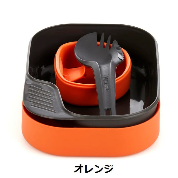 キャンプボックス ライトは、一人分の食事を全てサーブできるように設計された、コンパクトなメスキット (食事用の道具)。取り皿として使える2枚のプレートを蓋と受け皿にして、中に折りたたんだフォールダーカップとスポークが収まる仕組みで、キャンプやピクニックなど、軽食をとる場面で幅広く活用できます。